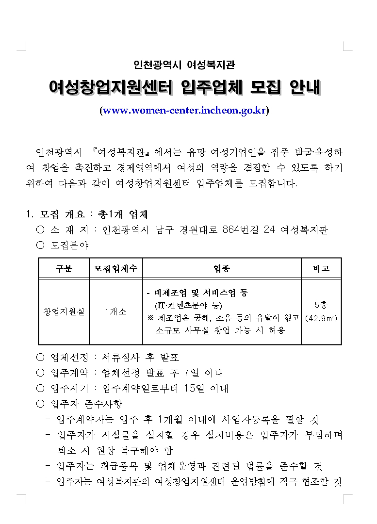 여성창업지원센터 입주업체 모집 안내(인천광역시 여성복지관)